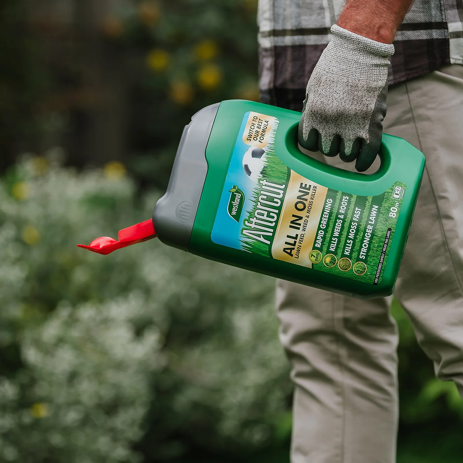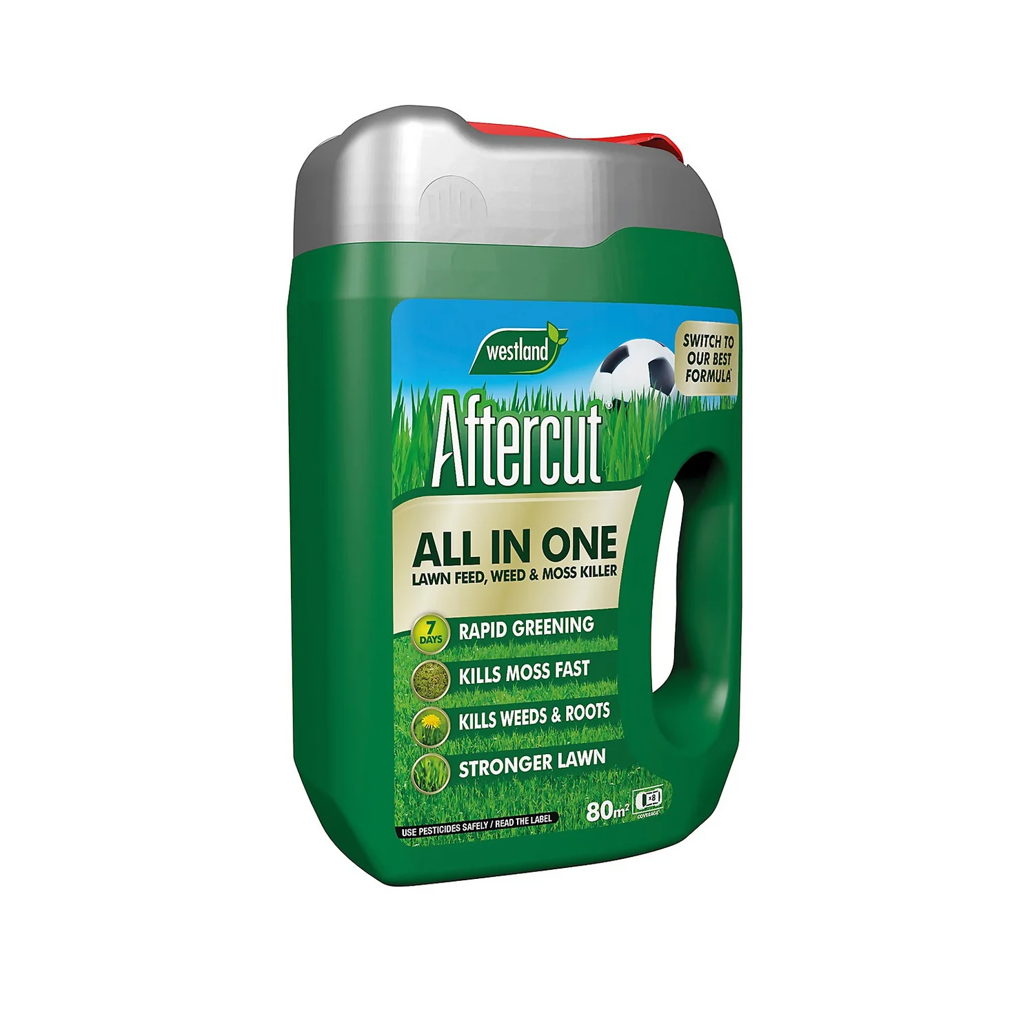 Aftercut All-In-One is a triple action lawn treatment that greens and feeds your lawn, whilst controlling weeds and moss. The effective formulation kills more than 12 type of common weeds on the lawn. Its balanced nutrient levels deliver lush results and a stronger lawn from root to tip.