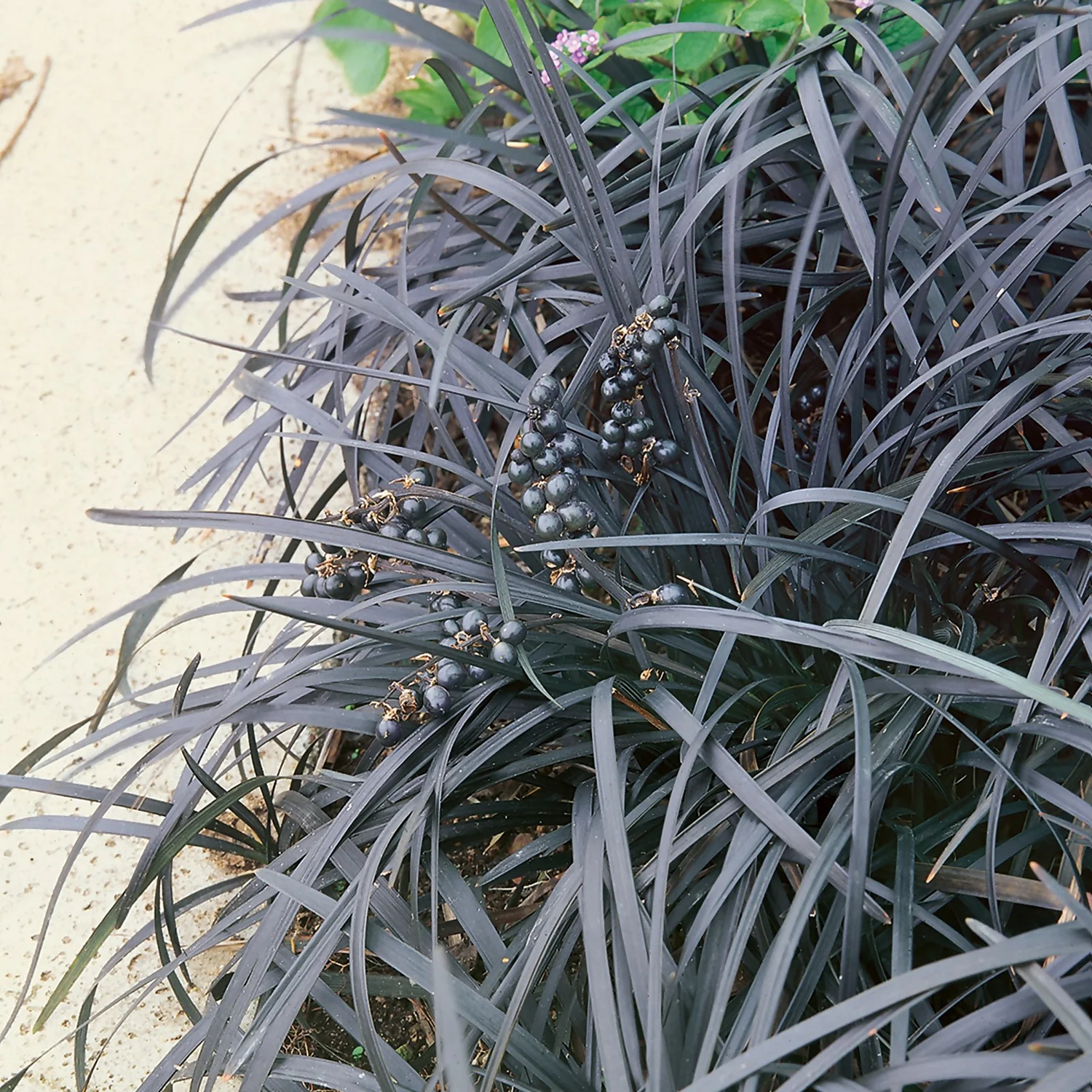 A clump-forming perennial having strap-like almost black leaves. Produces purplish white flowers on short stems throughout the summer.